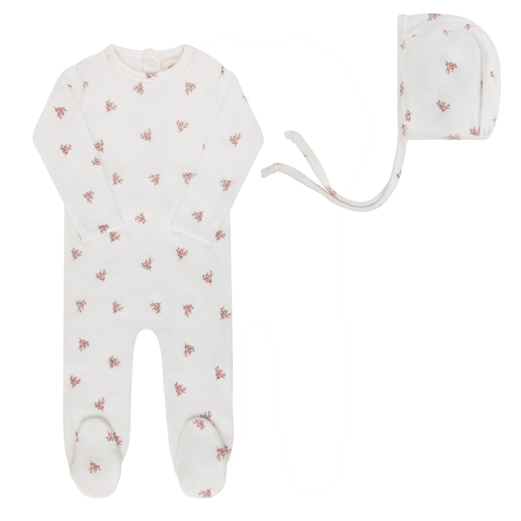 Velour leaf pattern collection - Footie and bonnet - Ivory girl