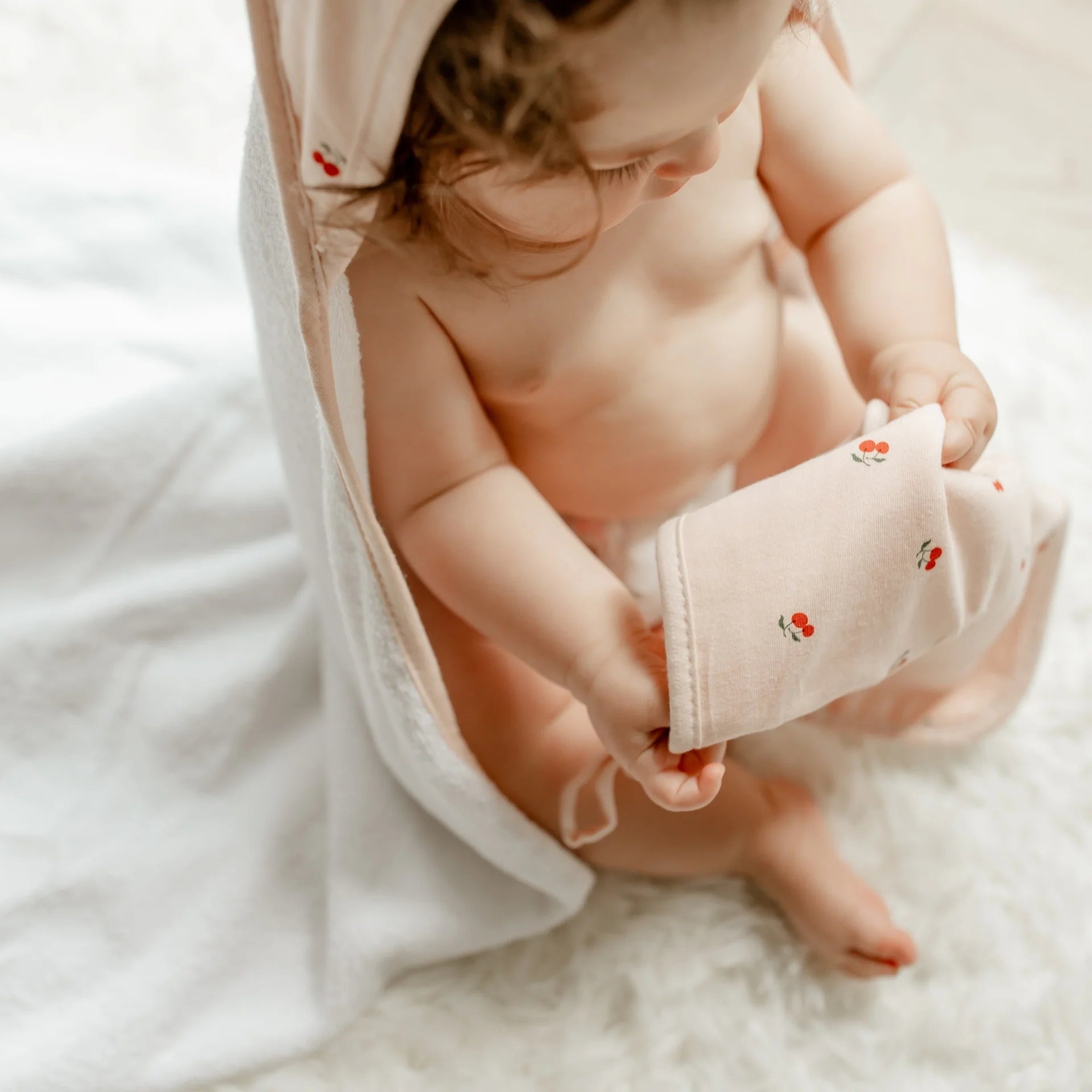 Printed hooded towel and washcloth set - Red cherries